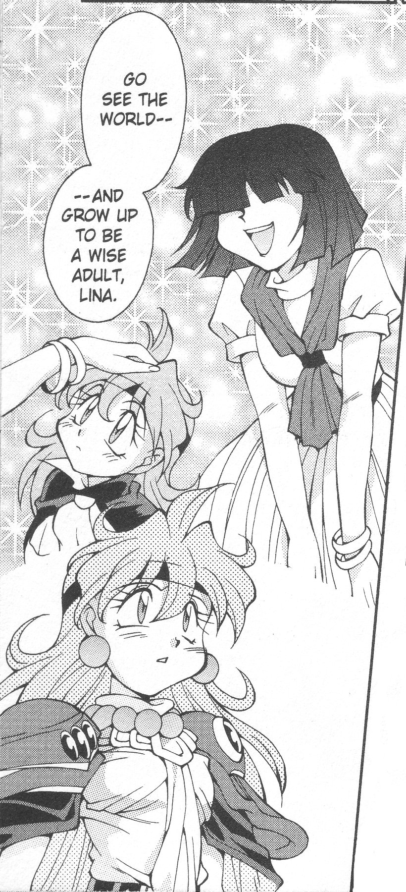 Лина и Луна некоторое время путешествовали вместе, что помогло будущей гениальной волшебнице сделаться таковой. Сестры вместе побывали в Королевстве Диррус. По дороге они услышали древнюю легенду о манускрипте, который когда-то хранился в королевском дворце, пока некто (какой-то абсолютный дегенерат, если хотите знать мнение Линочки) не сжег его. Возможно, это была одна из копий Клэрской Библии, и сестры захотели убедиться в ее подлинности. К счастью для Бандитоубийцы, содержание свитка уцелело, и ей удалось прослушать несколько священных текстов, прочитанных в ее присутствии. Шутки ради Лина соединила вместе два заклятия, которые услышала. И получила Гига-Слэйв.
